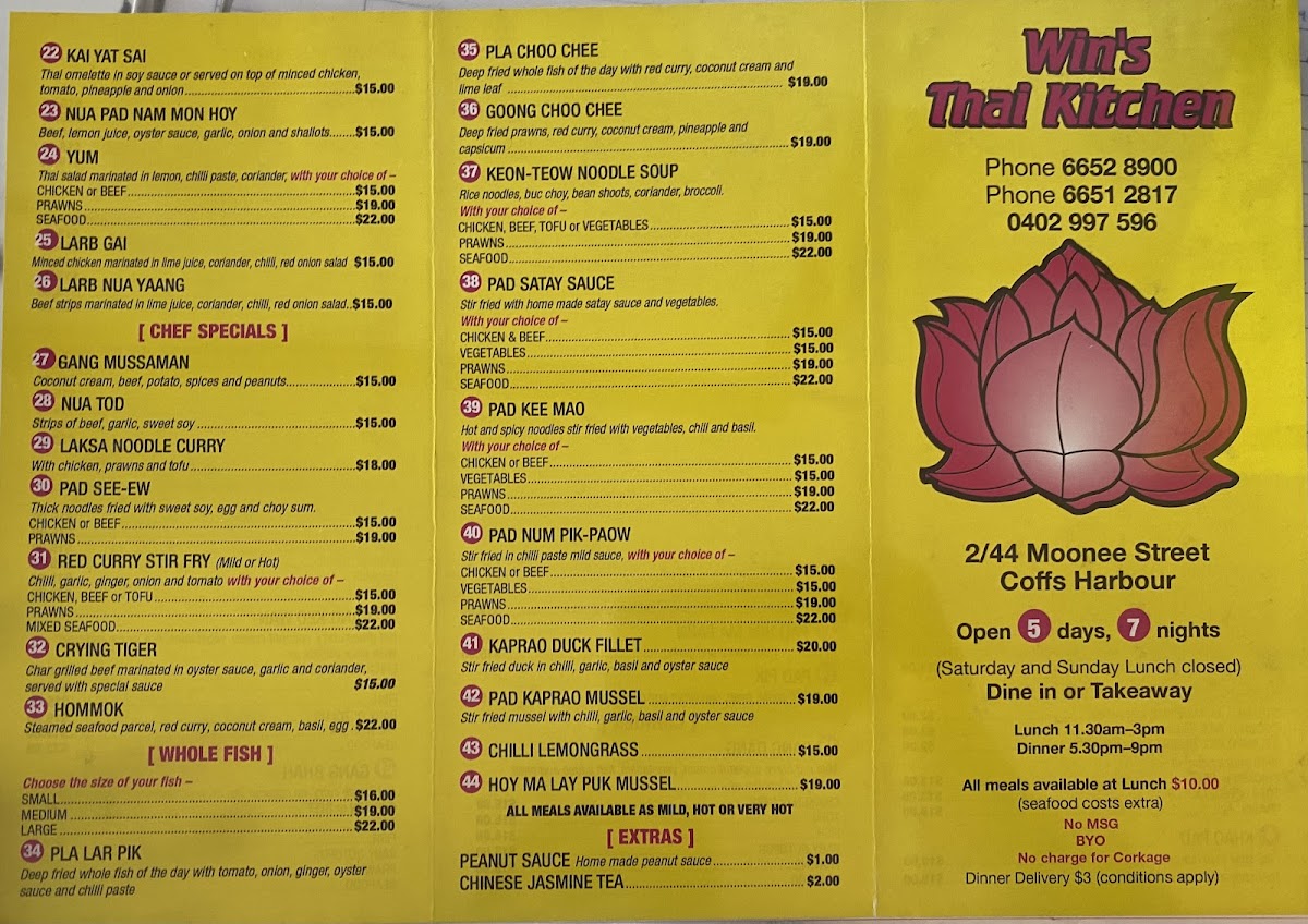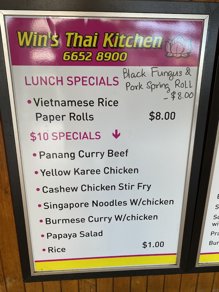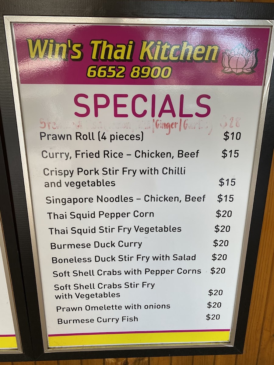 The menu at Win's Thai Kitchen offers an extensive selection of flavorful Thai dishes that promise to satisfy various tastes. Their curry offerings include options like Gang Dang Sapplot, Larb Nua Yaang, and Gang KareeLarb Gai, each brimming with aromatic spices and rich flavors. For soup lovers, the Tom Kah, Tom Jeat, and Tom Yum soups provide a delightful balance of heat and freshness. If you’re craving noodles or rice, the Coconut Rice and Steamed Rice Noodles are a perfect complement to any dish, while Pad Thai and Lard Na are popular noodle-based options. The entrée section features delicious bites like Samosa, Grilled Octopus (4 pieces), and Grilled King Prawns (1 stick), offering a variety of textures and tastes. For dinner, their stir-fry dishes such as Pad Pik, Tod Kratiem Pik Thai, and Pad Him Ma Parn are packed with vibrant ingredients and savory sauces. Specialties like Gang Massaman, Crying Tiger, and Laksa Noodle Curry bring bold flavors that represent Thailand's diverse culinary offerings. To enhance any dish, options like Peanut Sauce and Chili Lemongrass are available for an extra kick. Whether you’re in the mood for a hearty stir-fry or a comforting soup, Win’s Thai Kitchen provides an impressive range of traditional Thai dishes to satisfy every craving.