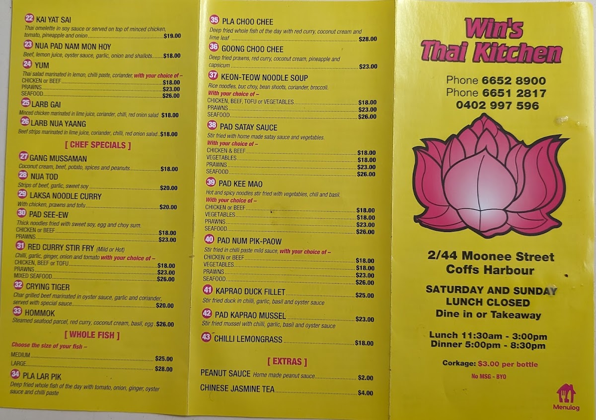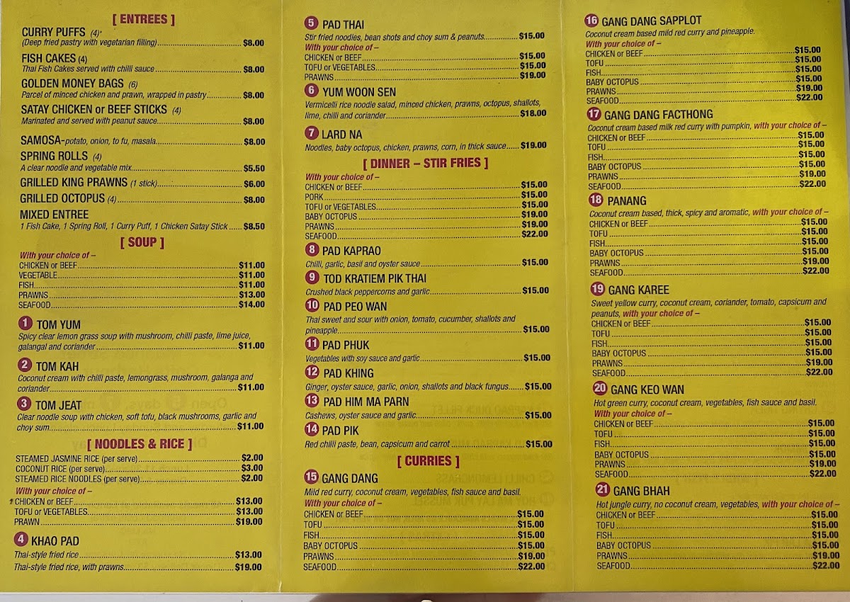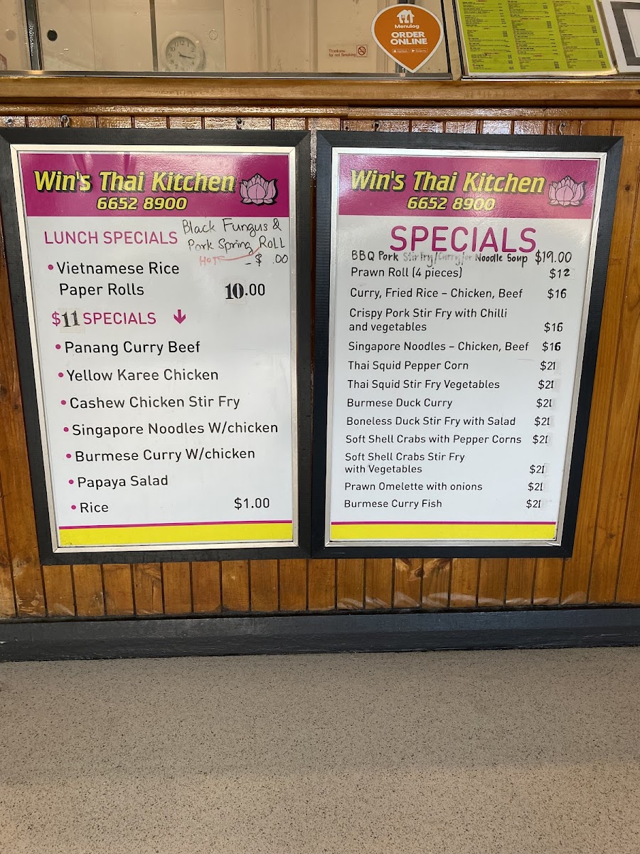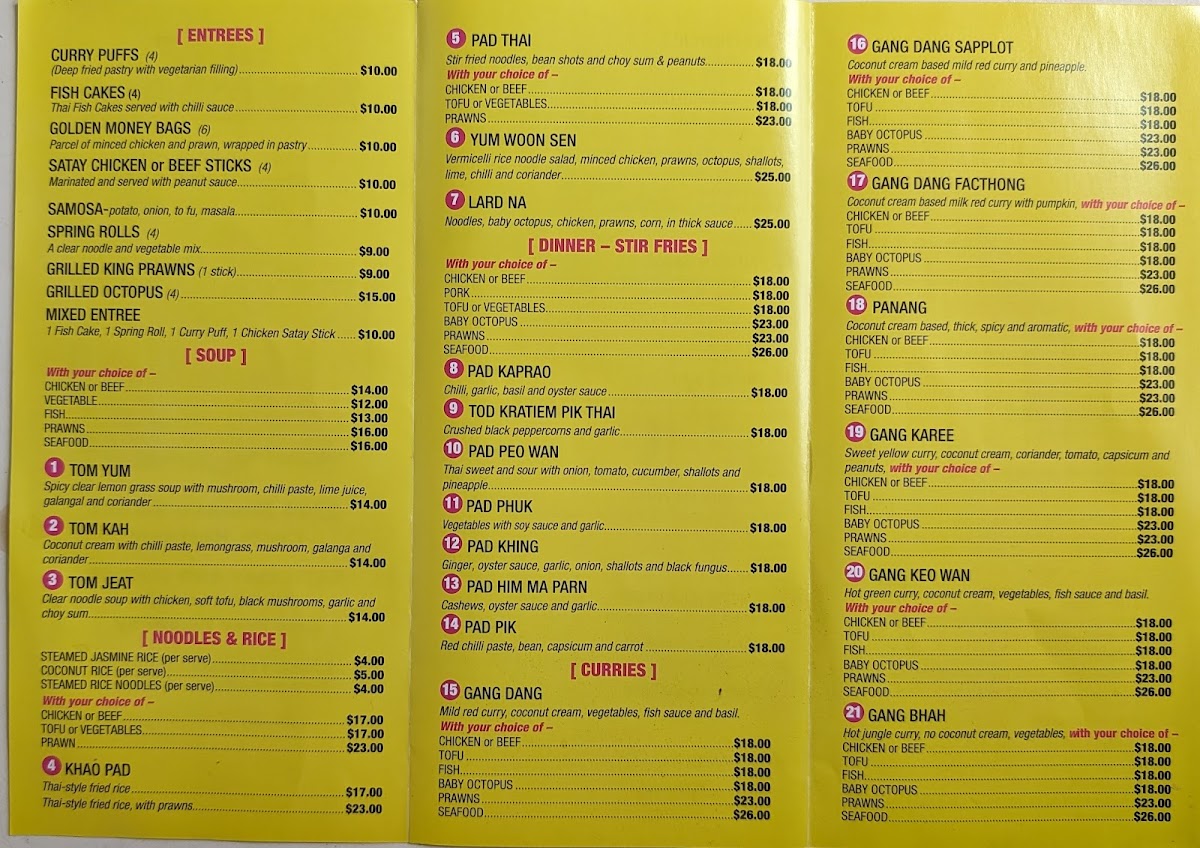 The menu at Win's Thai Kitchen offers an extensive selection of flavorful Thai dishes that promise to satisfy various tastes. Their curry offerings include options like Gang Dang Sapplot, Larb Nua Yaang, and Gang KareeLarb Gai, each brimming with aromatic spices and rich flavors. For soup lovers, the Tom Kah, Tom Jeat, and Tom Yum soups provide a delightful balance of heat and freshness. If you’re craving noodles or rice, the Coconut Rice and Steamed Rice Noodles are a perfect complement to any dish, while Pad Thai and Lard Na are popular noodle-based options. The entrée section features delicious bites like Samosa, Grilled Octopus (4 pieces), and Grilled King Prawns (1 stick), offering a variety of textures and tastes. For dinner, their stir-fry dishes such as Pad Pik, Tod Kratiem Pik Thai, and Pad Him Ma Parn are packed with vibrant ingredients and savory sauces. Specialties like Gang Massaman, Crying Tiger, and Laksa Noodle Curry bring bold flavors that represent Thailand's diverse culinary offerings. To enhance any dish, options like Peanut Sauce and Chili Lemongrass are available for an extra kick. Whether you’re in the mood for a hearty stir-fry or a comforting soup, Win’s Thai Kitchen provides an impressive range of traditional Thai dishes to satisfy every craving.